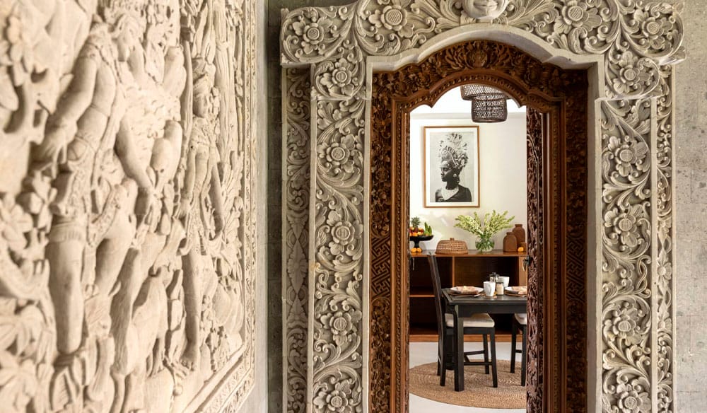Lovingly restored from a traditional Balinese residence, the sanctuary highlights Bali’s artistic heritage with intricate wood carvings, detailed stone murals, and tropical gardens adorned with stone sculptures. The space showcases treasures from across the Indonesian archipelago, including bespoke furniture and unique artifacts.