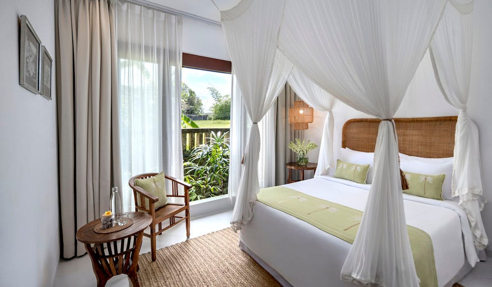Stay in beautifully crafted bungalows or private villas, complete with Bali’s signature clay tile roofs and expansive open-air verandas—perfect for lounging in the shade while enjoying serene garden views and tropical breezes.