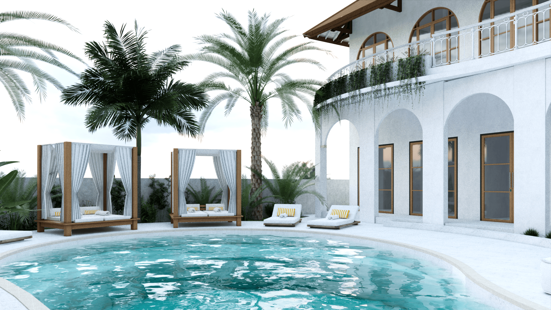 - Large central swimming pool with sun loungers set within lush tropical gardens in our main villa